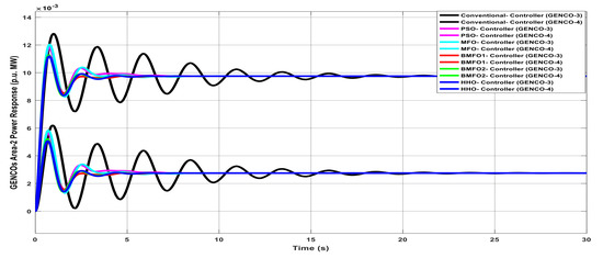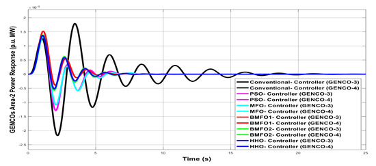 Dynamic response of GENCOs generation of Area2 with respect to time in seconds with various controllers like conventional, PSO, MFO, BMFO1, BMFO2, and HHO under unilateral contract are compared in Figure 8 and Table 8. The comparative outcomes obtained show improved results of the HHO controller with delay time 0.695 s and settling time of 19.8 s.