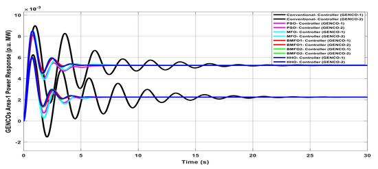 Dynamic response of Generation Companies (GENCOs) generation of Area1 with respect to time in seconds with various controllers like conventional, PSO, MFO, BMFO1, BMFO2, and HHO under unilateral contract are compared in Figure 7 and Table 7. The comparative outcomes obtained show improved results of the HHO controller with delay time 3.335 s and settling time of 20.86 s.
