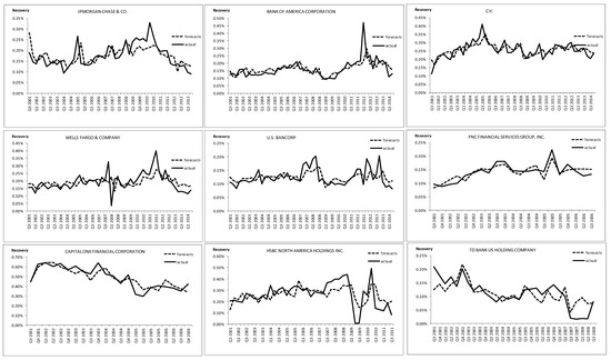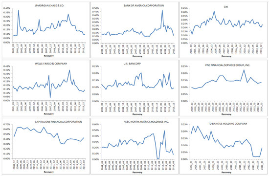 The analysis was performed for nine leading US banks, including JPMorgan Chase & Co., New York, NY, USA, Bank of America Corporation, Citi Group, Wells Fargo & Company, U.S. Bancorp, PNC Financial Services Group inc., Capital One Financial Corporation, HSBC North America Holding Inc. and TD Bank US Holding Company. Figure 1 presents recovery ratios calculated for all selected banks according to the specified procedure. For the first five banks, the data were available from I quarter 2001 up to I quarter 2014. For PNC Financial Services Group Inc. and Capital One Financial Corporation, the data were available from I quarter 2009 and IV quarter 2008, respectively. For TD Bank, the data were available since 2006 and for HSBC from 2004.