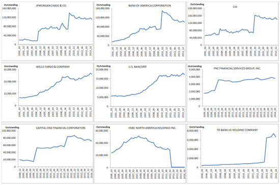 Figure 2 presents outstanding (credit cards) of particular banks available in FR Y-9C reports. It clearly shows that most banks encountered at least one spike during the last few years. These dynamic changes resulted from mergers, acquisitions, or portfolio sales. However, it shall be noticed that these changes didn’t impact long-run recovery rates significantly, which can be observed in Figure 1.
