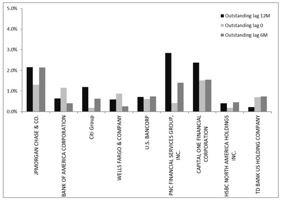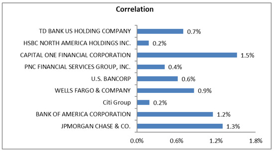 Figure 3 presents the results achieved for selected banks. The correlations appeared to be higher than zero and range from 0.2% to 1.5%. The lowest values (0.2%) were derived for Citi Group and HSBC. The highest value (1.5%) was calculated for Capital One Financial Corporation.