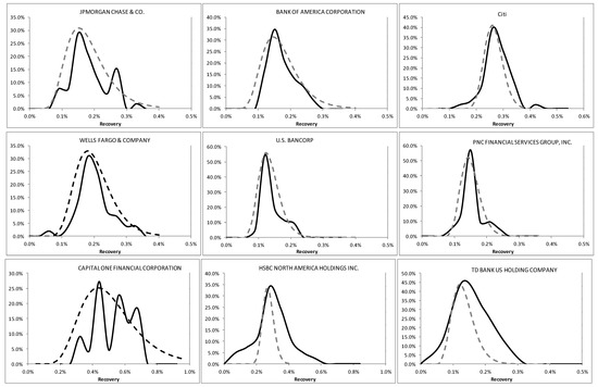 As can be observed, the correlation results are consistent for most of the banks. The most considerable differences were observed for PNC Financial Services, where both 6 M and 12 M lag resulted in higher correlation. Furthermore, Citi Group revealed a substantial change. However, it should be noticed that the overall range of correlation was not changed substantially. The banks with initially calculated low correlations are still below an average. That proves that the proposed method is robust and can be utilized to estimate the correlation and calculate recoveries’ distribution function.