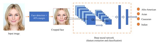 Outline of the proposed solution. The face region is extracted using an off the shelf face detector and it is further enlarged. A convolutional neural network is used to extract the relevant features and determine the race.
