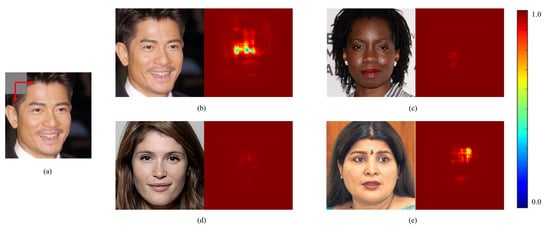Masking procedure and heatmaps obtained after iteratively masking the images. (a). Masking procedure: the images is iteratively masked with a gray rectangle and the probability of the correct class is used to generate a heat-map (b). Heat-map for the Asian class. (c). Heat-map for the African-American class. (d). Heat-map for the Caucasian class. (e) Heat-map for the Indian class.
