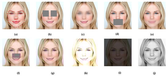 Image alterations. (a) The 68 facial landmarks used in the localization of facial regions. (b) occlusion of the eyes. (c) radial blur or the eye area. (d) occlusion of the nostril area. (e) radial blur or the nostril area. (f) occlusion of the mouth area. (g) radial blur of the mouth area. (h) Gaussian blur of the entire image. (i) Increase brightness with a factor of 1.5. (j) Decrease brightness with a factor of 0.5.