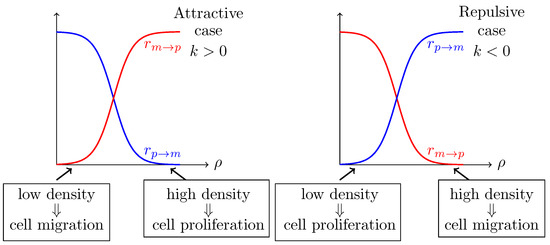 The phenotypic switching is regulated by local microenvironmental cues, being lumped into local density dependence. For the sake of simplicity, we will assume that both switching rates, and , depend monotonously on cell density, approximated by a sigmoid function with slope parametrized by k. Intuitively, the slope can be viewed as the way that single tumor cell interprets its microenvironment and decides over its phenotype. The parameter represents the critical cell density value at which the probabilities of switching from one phenotype into the other are the same. Following [13], we consider that the two rates are complementary, namely if cell motility increases with cell density then cell proliferation decreases with density and vice versa: namely if k denotes the slope of the switch from motile type to proliferating type, then denotes the slope of the switch from proliferating type to motile type. A possible choice is given by the following, see also Figure 2,