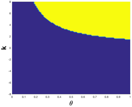 Allee effect in the deterministic system (59): The yellow area represents the area where 0 is stable for this system, whereas the blue one depicts the area where 0 becomes unstable.