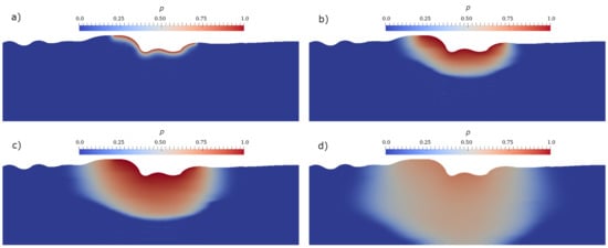 Numerical results for pressure that correspond to time step: (a) (b) (c) (d) . This results are coarse grid solutions using 8 basis functions ().