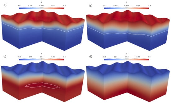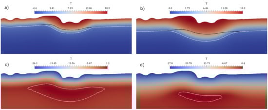 Numerical results for temperature (a) (b) (c) (d) , where white line is isocline of zero for saturated soils. This results are a coarse grid solution using 8 basis functions ( 31,752).