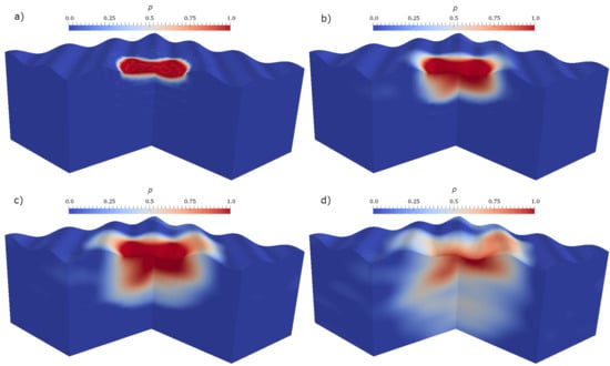 We expand the 2D problem to the problem in a three-dimensional setting (Figure 6). The area in the plan has the same dimensions of 10 m and a height of 6 m. The computational grid has the dimensions 522,774 and 35,844,142. All characteristics of the problem remain the same as in the case of 2D. The calculations were carried out for 1 year with a time step of h. To generate the soil surface, we used the following surface equation . At the center of this geometry, there is a pronounced depression through which liquid seeps. This depression serves as an analog of places where water from precipitation accumulates.