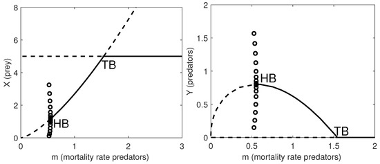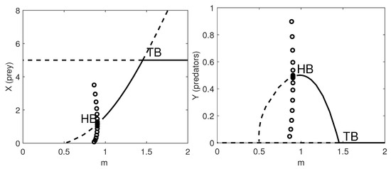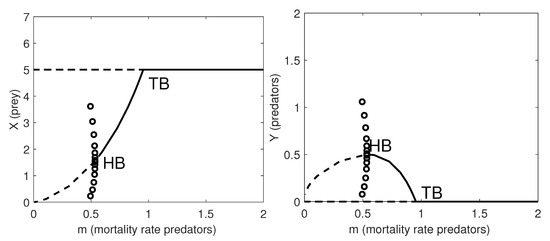In Figure 1 we give the one-parameter bifurcation diagrams with respect to the natural mortality rate of the predators, m. Note that when , the system undergoes a supercritical Hopf bifurcation (HB) and a stable limit cycle appears. At , a transcritical bifurcation occurs, where the coexistence equilibrium loses its stability and the predator-free equilibrium becomes stable.