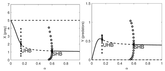 One-parameter bifurcation diagram with respect to . Left panel: the prey population dynamics. Right panel: the predator population dynamics. Thick lines: stable equilibria; dashed lines: unstable equilibria; SHB: supercritical Hopf bifurcation point where a stable limit cycle arises with maximum amplitude given by the amplitude of the SHB (circles); UHB: subcritical Hopf bifurcation point, where an unstable limit cycle arises with maximum amplitude given by the amplitude of the UHB (pluses); TB: transcritical bifurcation point where the coexistence equilibrium exchanges its stability with the prey-only equilibrium. The remaining parameter values are as in Table 7.