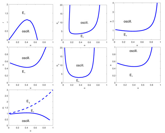 The dynamic described in Figure 6 is similar to the one in Figure 2. There are two main differences: in the two-parameter bifurcation diagrams with respect to and the HB curve is more concave; when we vary the parameter pair (this case is not present in Figure 2), one can see that the HB occurs for all values of h and for m smaller than a threshold value.