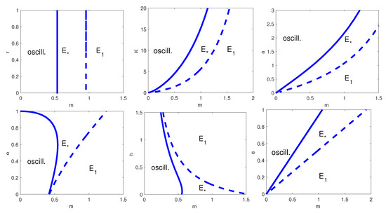Two-parameter bifurcation diagram with respect to m and, from top left to bottom right, r, K, a, , h and e. Thick line: HB curve; dashed line: transcritical bifurcation curve. is the coexistence equilibrium and the prey-only equilibrium. The remaining parameter values are as in Table 8.