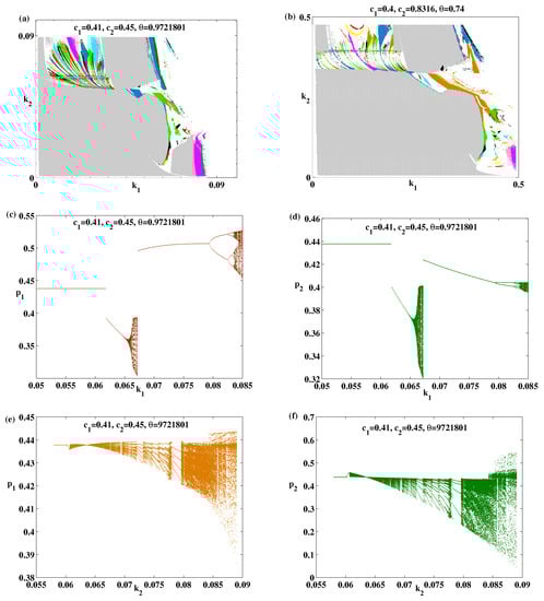 (a,b) 2D bifurcation diagram of the system in the parameter plane. The light gray color refers to the stability region of the fixed point. Other colors are for different types of period cycles. The white color refers to the non-convergent points. (c,d) Bifurcation diagrams with respect to and on varying at: and . (e,f) Bifurcation diagrams with respect to and on varying at: and .