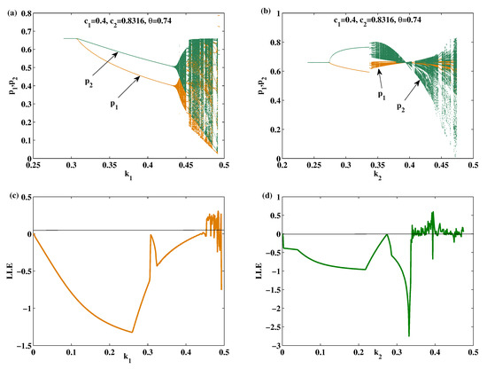 By looking at the map (13) one can see that it contains five important parameters, and . We start our numerical analysis by investigating the influences of and on the stability of the map. Figure 1a,b present 2D-bifurcation diagrams in the -plane at two different sets of parameters’ values. These sets are and for the same datum . Figure 1a shows different colored regions on where different periodic cycles, chaotic attractors, and closed invariant curves coexist due to both Neimark–Sacker and flip bifurcation. Figure 1b presents closed invariant sets due to Neimark–Sacker bifurcation followed by flip bifurcation. Therefore, we study, in the next section, the global influence of the parameters and separately in the dynamic of map (13). Now, we study the local impact of these parameters by assuming . Figure 1c presents a situation of stable equilibrium point for any value of the parameter until this parameter reaches the value on where there are two routes to two different types of bifurcations, Neimark–Sacker comes first then followed by flip bifurcation. The same observation is presented in Figure 1d for the variable . At the parameters set , Figure 1e,f show the bifurcation diagrams for the map’s variables when varying the parameter . Another mixed scenario arises when we assume the following set of parameter values, . At this set, the equilibrium point becomes stable when varying either or until closed invariant curves are born because of Neimark–Sacker bifurcation. Afterward, higher periodic cycles and chaotic attractors coexist due to flip bifurcation, as shown in Figure 2a,b. This discussion shows that the speeds of the adjustment parameters and have a great impact on the map’s equilibrium points. There is more evidence by which we confirm that the map enters chaotic regions. The evidence is confirmed by plotting the largest Lyapunov exponent (LLE). It is known that when LLE takes positive values, it means that the map’s dynamic behavior enters chaotic regions and, hence, closed invariant curves or higher period cycles, and then routes to chaos coexist. We show in Figure 2c,d the corresponding LLE for the two cases plotted in Figure 2a,b with respect to the parameters and .