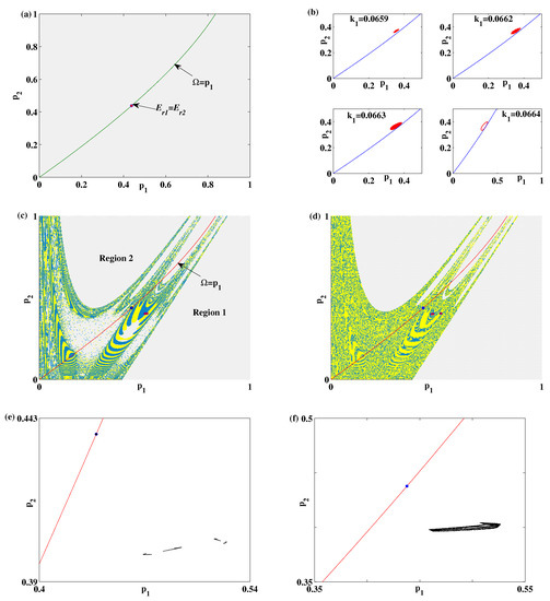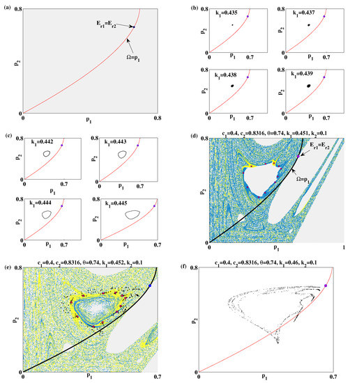 and the eigenvalues in both regions are and . They are real eigenvalues and lie within the unit circle and . In addition, we have and . It is clear that and that means the map (13) is dissipative in both regions of the border curve and the triangles of stability are satisfied. Figure 3a shows the basin of attraction of the coincided equilibrium points born on the border curve. It is plotted at the same set of the parameter values. Now, we show the rise of the multistability of attractors, as the speed of the adjustment parameter increases, the other parameter values remain fixed. We should note that all of the numerical simulations were carried out based on the initial data of decision variables and . In the following figures, iterations of the map (13) present different attractors with their basins, using sets of initial conditions at the long run. Increasing the bifurcation parameter to , the equilibrium point becomes unstable and the dynamics of the map converts into a spiral on one side from the border curve, as shown in the top left in Figure 3b. Increasing that parameter further gives rise to larger spiral points and then they convert into a closed invariant curve due to the Neimark–Sacker bifurcation at . This closed invariant curve is tangent to the border curve. This closed invariant curve continues to appear until , where the period-2 cycle is born due to the coexistence of flip bifurcation. It is plotted in Figure 3c with its basin of attraction. As one can see, this period is born on region 1, but its basin is distributed in both regions from the border curve. Increasing further gives rise to the period-4 cycle, which has a complicated basin of attraction distributed in both regions in Figure 3d. Others increasing in this parameter give four chaotic areas, which start gathering into two chaotic areas, then finally become one chaotic attractor, as shown in Figure 3e,f. It is obvious from the 1D bifurcation diagrams presented in Figure 1c,d that the bifurcation parameter affects the complex dynamic of the map (13). The dynamics start first with a stable equilibrium point, then closed invariant curves in region 2 appear due to Neimark–Sacker. Afterward, higher periodic cycles and chaotic attractors are born in region 1 due to flip bifurcation. This means that the map’s dynamics jumps from Neimark–Sacker to flip bifurcation.