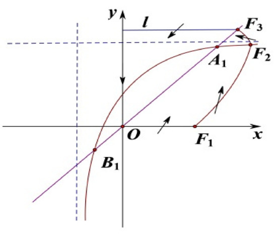 Now, we are going to prove that the solution of system (9) is eventually uniformly bounded (see Figure 2). Take a point on x-axis, draw the trajectory passing through the point of the following equation