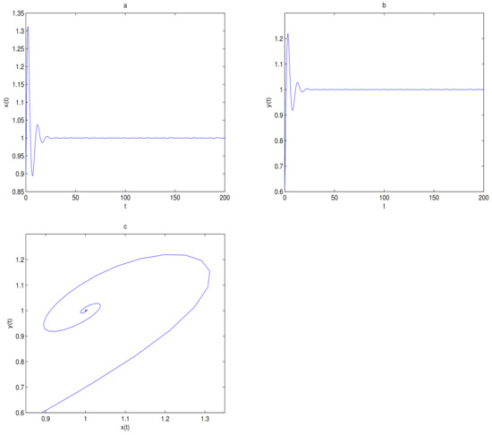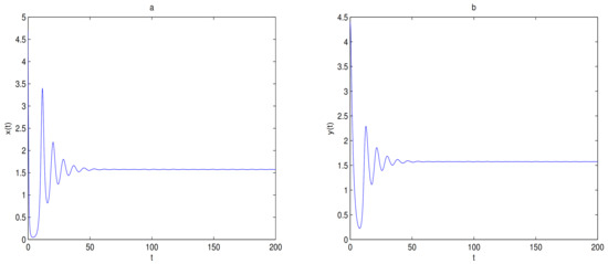 In the following, applying dde23 in matlab, we verify our theoretical results by numerical simulations for system (9). According to the numerical constraints in the theorems, we first determine the values of b, r and c. Combined with numerical simulations, and try several times to find the value of that meets the conditions. For the value of , it is easy to calculate with the given conditions. All figures correspond to the cases in the table above.