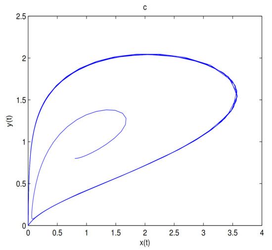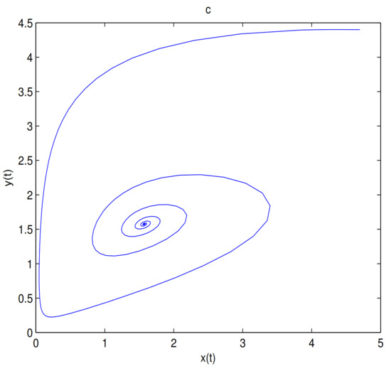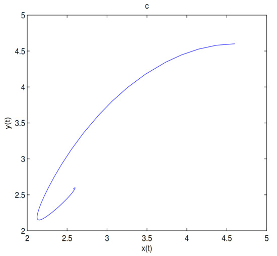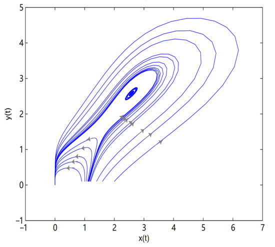 For Theorem 4, let and , O is the only equilibrium point of system (9) at this time, and O is globally asymptotically stable. In here initial values are (6, 2.5), (6, 2), (6, 1.5), (6, 1), (4, 0.1) and (2, 0.1), we see that all trajectories tend to O (see Figure 8). Let and , O is always locally stable, and is always a saddle. is locally stable when . the trajectory tends to when the initial value is selected in the attraction domain of , for example, (see Figure 9). The trajectory tends to O when the initial value is selected in the attraction domain of O, for example, (see Figure 10). is a center-type equilibrium point when , in here initial values are (2.57, 2.57), (2.42, 2.42), (2.1, 0.1), (1.6, 0.1), (1.4, 0.1), (1.2, 0.1), (1.18, 0.1), (1.15, 0.1), (1.14, 0.1), (1.135, 0.1), (1.133, 0.1), (1.131, 0.1), (1.13, 0.1), (1.1, 0.1), (1.05, 0.1), (1, 0.1) and (0.9, 0.1) (see Figure 11). is unstable when , and a limit cycle is generated by Hopf supercritical bifurcation in the neighborhood of . We choose as initial value (see Figure 12c). We choose the same initial values as in Figure 11, and we see that the trajectory forms a limit cycle with (2.57,2.57) as the initial value, and everything else tends to O (Figure 12d).