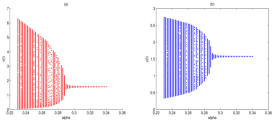 There is a supercritical Hopf bifurcation when passes through 0, i.e., passes through 0.288. Here , . Figure (a) is a biurcation diagram of with respect to , and Figure (b) is a bifurcation diagram of with respect to .