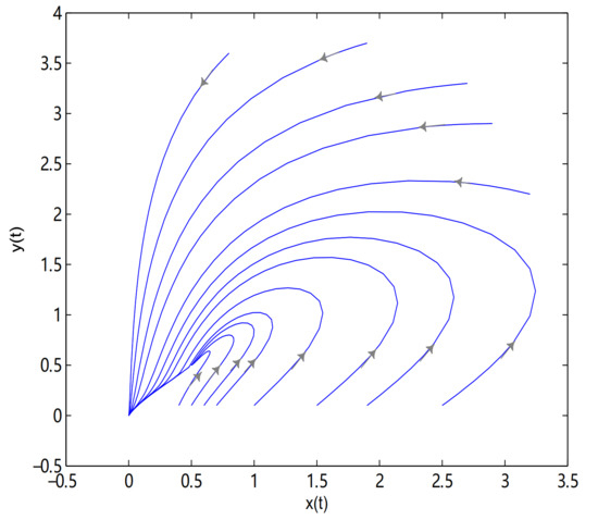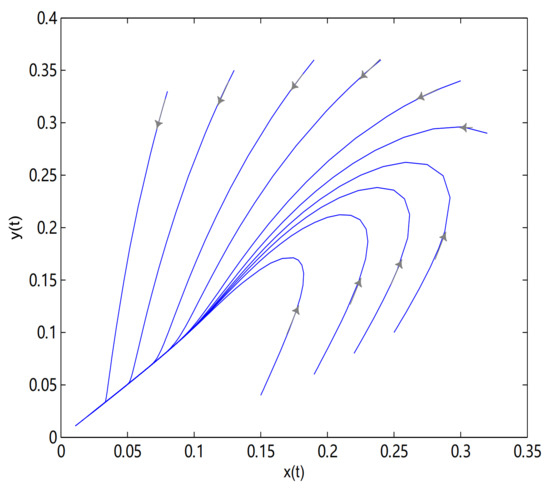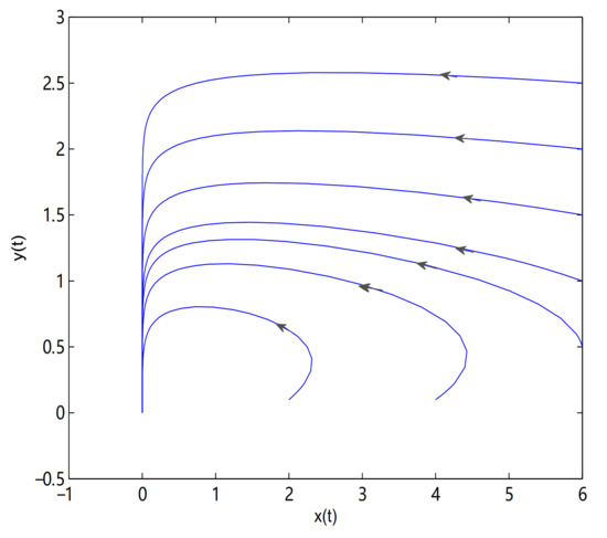 For Theorem 5, let , O is always globally asymptotically stable, and are merged into a single equilibrium . Meanwhile, is a saddle node when , in here initial values are (2.7, 3.3), (2.9, 2.9), (0.8, 3.6), (3.2, 2.2), (1.9, 3.7), (2.5, 0.1), (1.9, 0.1), (1.5, 0.1), (1, 0.1), (0.7, 0.1), (0.6, 0.1), (0.5, 0.1) and (0.4, 0.1) (see Figure 13). is a degenerate critical point when , in here initial values are (3.1, 3.3), (3.7, 2.9), (0.8, 3.6), (4.1, 2.2), (1.9, 3.7), (2.5, 0.1), (1.9, 0.1), (1.5, 0.1), (1, 0.1), (0.7, 0.1), (0.6, 0.1), (0.5, 0.1) and (0.4, 0.1) (see Figure 14).