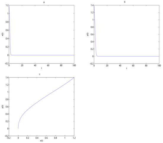 When , it is easy to get and . So the equilibrium O is locally stable. Particularly, when and , System (9) has only one equilibrium . According to what we have proved before, the solution of system (9) is eventually uniformly bounded in under this case. Since is the isoclinic line, it is not possible in the whole plane to have a closed orbit which surrounds the equilibrium O. If system (9) has a limit cycle which exists in first quadrant, it must contain the equilibrium in the limit cycle. However, under this circumstance, system (9) has no other equilibria except , so we have the conclusion that system (9) has no limit cycle when and . Like the proof of Theorem 1, we know that equilibrium O is globally asymptotically stable when and ; that is, all trajectories of the solution tend to equilibrium O if and .