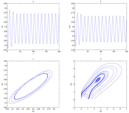 When then , which means the positive equilibrium is locally stable. When then , which means the positive equilibrium is unstable. In addition, the solution of system (9) is eventually uniformly bounded in , so there exists at least one limit cycle in a small neighborhood of .
