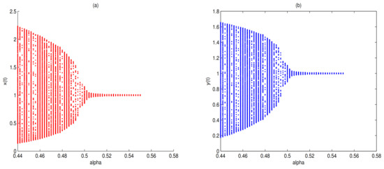 There is a supercritical Hopf bifurcation when passes through 0, i.e., passes through 0.5. In here . . . Subigure (a) is a bifurcation diagram of with respect to and subfigure (b) is a bifurcation diagram of with respect to .