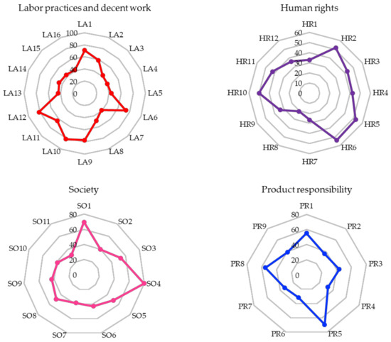 In Figure 2, the indicators are distinguished with a different colour depending on their appearance. The first factorial axis is characterized by the indicators of products responsibility (PR), and is represented in green, social aspects (SO) in red, and in blue those corresponding to human rights (HR). Regarding the second factorial axis, they are the indicators of labour practices and decent work (LA) that define it, in purple. Based on the direction of the social indicators, the sustainability gradient from the left (less) to the right (more) has been defined. In this sense, on the left side of factorial axis 2 are the companies that report indicators of social aspect less frequently. On the other hand, in quadrants 1–4, the companies with the greatest social disclosure are located.