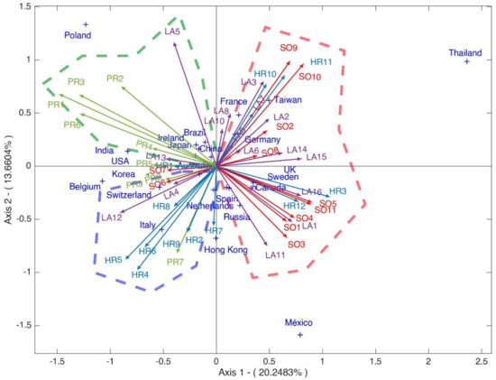 The first and fourth quadrant (red line) show the countries corresponding to the companies that most frequently disclose the aspects of society (SO), human resources (HR) and labour practices and decent work (LA). The countries that present CSR in these aspects are Germany, Sweden, Canada, Spain, France, Russia, Mexico and Thailand.