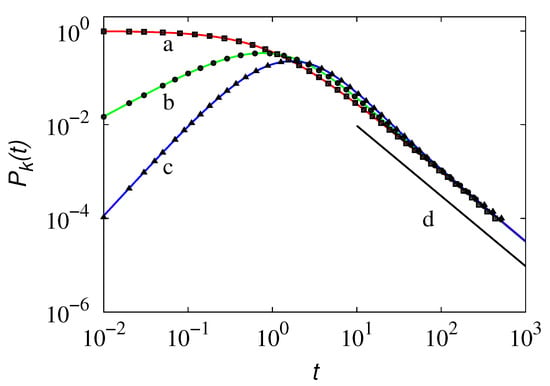 Figure 1 depicts the first counting probabilities , for the simple process defined by Equation (15) with and . Solid lines (a) to (c) represent the theoretical expressions (12), while symbols represent the results of stochastical simulations. The simulations correspond to an ensemble of particles. Choosing a time step (in the simulations ), at each time , the probability of a new event is given by , where is the local value of the age at time . If no events occur, then , and otherwise ; i.e., it is reset to zero.