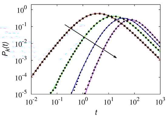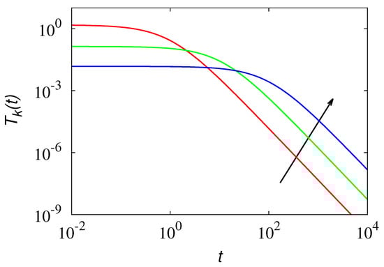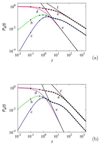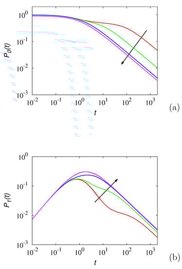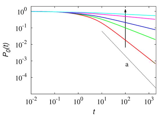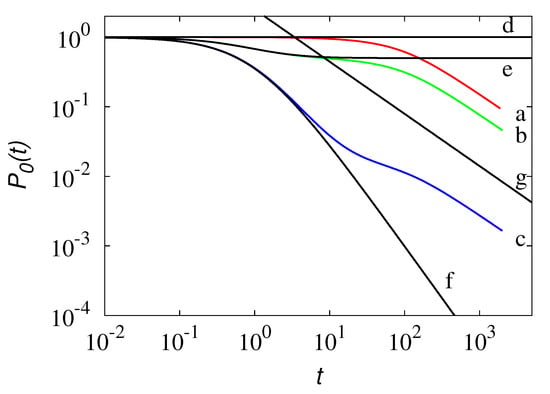 Another interesting property can be observed from the decay of at intermediate time scales. For small (in the case of the data depicted in Figure 7, this means ), the probability displays a relaxational transition from the initial scaling for , pertaining to the bare counting process in the absence of environmental fluctuations to the long-term scaling .