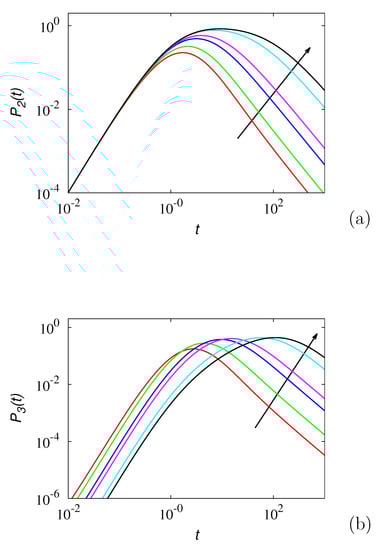 Figure 4 depicts the counting probabilities and -panel (a) and (b), respectively-for the same process at , by changing the value of , from (simple process) to . Furthermore, for this class of processes, the asymptotic scaling of the counting probabilities follows Equation (16), as it is controlled by the functions , and , for any k.