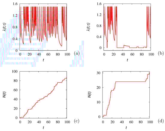 where is a Poisson process characterized by the transition rate . For the sake of clarity, we assume for the more general initial conditions, , , and , , where are probability weights, . Under this assumption, the transition rates vanish (blocking conditions) whenever the parity of is odd and attain the value when even. A realization of this process is depicted in Figure 5 panel (b). For , the functional form (15) has been chosen, with , . Panel (a) depicts the evolution of for the corresponding simple counting process (i.e., in the absence of environmental stochasticity, ). The transition rate over the realization of the process changes with time, because the age depends on time, and returns to zero after each transition. In panel (c), the corresponding behavior of —i.e., the number of events up to time t—is depicted. Panel (b) refers to Equation (33) for , with . The realizations depicted in panels (a) and (b) refer to the same initial seed in the use of the quasi-random number algorithm implemented.