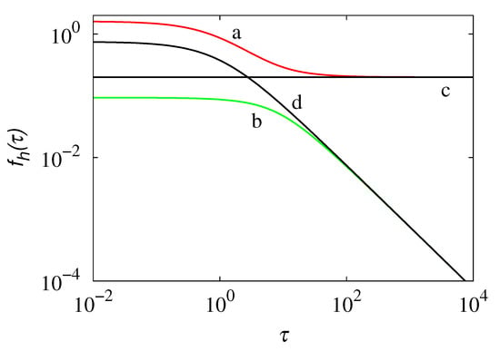 since for large , . Figure 9 depicts the behavior of the two functions , , for expressed by Equation (15) with and , enhancing the two long-term asymptotes expressed by Equations (49) and (50).