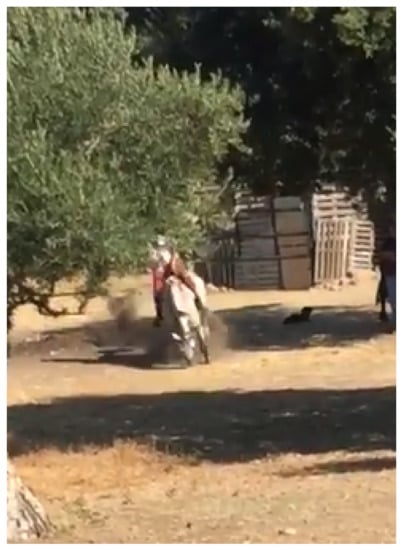 Low quality photogram of a real life video of a horse with an atrial fibrillation collapsing during exercise. We are used to seeing scenes of horses falling to the ground in Western films, but they are not real. The great value of this image is that an amateur video captured the precise moment when the poor horse unexpectedly collapses (its head is very low) and the rider (whose legs are clearly visible and is going to be thrown over the horse’s head). We include the image here despite its low quality because we consider it a real document illustrating the dangers of a horse collapsing during exercise.