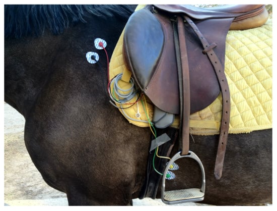 A horse with the electrodes for the exercise electrocardiography already placed.