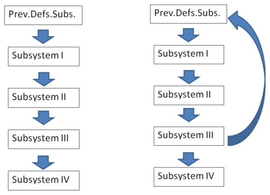 Example of perfect flow in the cascade of subsystems (left). Example of flow in the cascade of subsystems when Subsystem IIIa asks an “exercise electrocardiogram” to be carried out: when these data are obtained the knowledge extraction process is restarted (right).