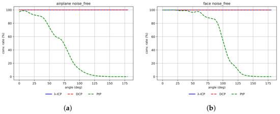 Convergence rate of -ICP (blue), DCP (red), PtP (green) algorithms for: (a) airplane; (b) human face.