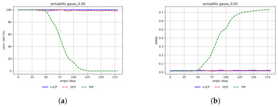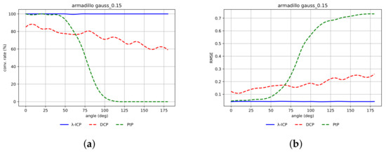 (a) Convergence rate of -ICP (blue), DCP (red), PtP (green) algorithms for Armadillo with Gaussian noise, ; (b) mean RMSE (for transformation matrices) of -ICP (blue), DCP (red), PtP (green) algorithms for Armadillo with Gaussian noise, .