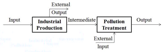 Considering industrial production and pollution treatment in China, this paper regards the system as a general two-stage model (see Figure 1) [2,3,4]. The first process (referred to as industrial production) denotes the industrial production process, while the second process (referred to as pollution treatment) represents the pollution treatment process. The outputs of stage 1 consist of endogenous (intermediate product) and exogenous outputs, where the endogenous outputs are designated in stage 2. The inputs of stage 2 derive from the endogenous and exogenous inputs, wherein the endogenous inputs are the endogenous outputs from stage 1. To render the entire system more perspicuous, the performance of each process ought to be described while the comprehensive performance of the entire system is obtained.