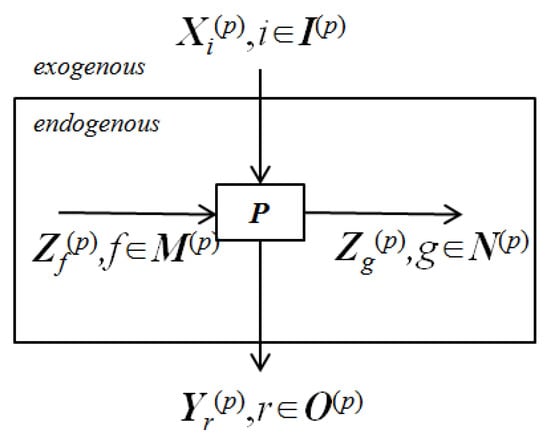 Considering a general network system as shown in Figure 2, each process p (p = 1, …, q) of DMU j (j = 1,…,n) uses exogenous inputs , supplied from outside of the system, and the endogenous inputs , are produced by other processes to produce the exogenous outputs , as the final outputs of the system, while the endogenous outputs , are to be used by other processes. The sets , , , and contain the exogenous and endogenous inputs, and the exogenous and endogenous outputs are used and produced by process p. The production possibility set is defined as: