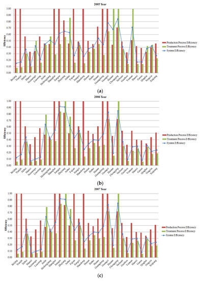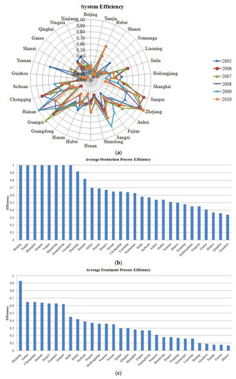 Based on Model (7) and the selection of variables in Section 4.1, the efficiencies based on the period of 2005–2010 were obtained as shown in Table A2 of the Appendix A. “Process 1” presents the efficiency of the industrial production process, “process 2” presents the efficiency of the pollution treatment process, and the “system” presents the efficiency of the whole system. Notably, the higher the value of efficiency, the more efficient the region. A region can be defined as totally efficient when its efficiency value is 1, and if the value is less than 1, then this region is inefficient and remains to be improved.