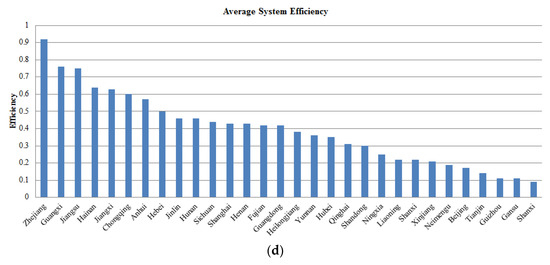 To comprehensively reflect the efficiency value rankings throughout the whole study period, we computed the average efficiency in five years as the basis of our rankings. Figure 4b shows the ranking of the average efficiency of the production process, where the following developed regions performed efficiently: Beijing, Tianjin, Shanghai, Jiangsu, Fujian, Shandong, Guangdong, and Guangxi, with the less developed regions at the bottom of the ranking. Figure 4c shows the ranking of average efficiency of the pollution treatment process; it is evident that the efficiency of seven regions is significantly higher than in other regions—namely, Zhejiang, Anhui, Chongqing, Hainan, Jiangxi, Guangxi, and Jiangsu. These seven regions are mostly less developed regions, while the developed regions such as Beijing, Shanghai, and Tianjin rank 26th, 17th, and 28th, respectively. Thus, this phenomenon can be drawn on to conclude that no inevitable relationship exists between the two processes; for instance, a certain process with high efficiency cannot determine the high or low efficiency of another process. The average efficiency of the whole system is shown in Figure 4d, where seven regions are observed to rank at the top in terms of average system efficiency: Zhejiang, Guangxi, Jiangsu, Hainan, Jiangxi, Chongqing, and Anhui. Notably, the regions ranked in the top seven in terms of average system efficiency are the same regions as in process 2, but not in process 1. The top seven regions in process 2 and system also have high rankings in process 1. Considering the effects of the two processes on the system efficiency, process 1 and process 2 have a positive influence on system efficiency.