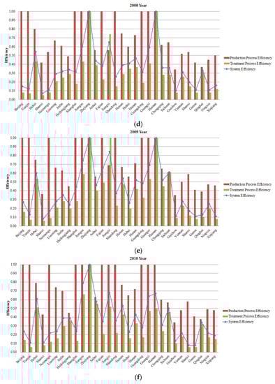 (a) System and process efficiencies in 2005. (b) System and process efficiencies in 2006. (c) System and process efficiencies in 2007. (d) System and process efficiencies in 2008. (e) System and process efficiencies in 2009. (f) System and process efficiencies in 2010.