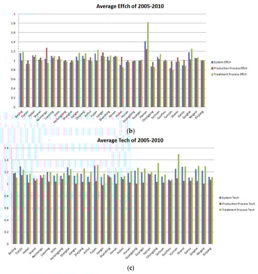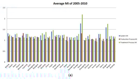 The average system GM (SGM) index, production process GM (PGM) index, and treatment process GM (TGM) index of 2005–2010 for 30 regions are shown in Figure 6a, where the average GM index of most regions is greater than 1, which means that most regions made progress in their production and treatment systems during 2005–2010. Furthermore, the SGM index is obtained mostly between PGM and TGM; therefore, the SGM is clearly determined jointly by two processes, although some regions do not present this characteristic as strictly, including Beijing and Shanghai, where the SGM is greater than the PGM and TGM. However, considering the data in Figure 6a showing the averages of 2005–2010, the comprehensive exhibition of data could cover some characteristics. Based on Figure 6a, for each year in Beijing, the SGM was always obtained between the PGM and TGM; however, the PGM and TGM do not present any stable trend of being greater than one another, thus causing the average SGM to be greater than the average of the PGM and TGM. We can observe that most regions show greater TGM than PGM, which means that the TGM is the main contributing factor for the progress of the SGM.