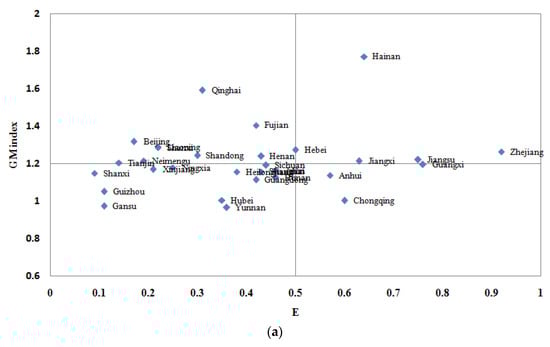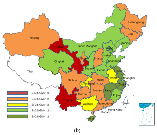 To study the performance of overall system efficiency and system GM index comprehensively, and consider the geographic characteristics at the same time, we illustrated the average system efficiency and average system GM index in the period 2005–2010 as the horizontal and vertical coordinates in Figure 7a. We coloured the regions in different distribution on the map for clear observation in Figure 7a.