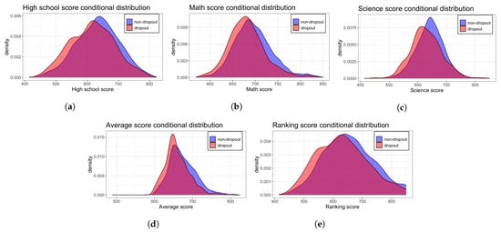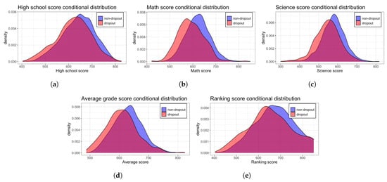 Score conditional distributions based on the DROPOUT variable, with respect to each variable within the Universidad Adolfo Ibáñez dataset. (a) Variable nem. (b) Variable mat. (c) Variable optional. (d) Variable pps. (e) Variable ranking.
