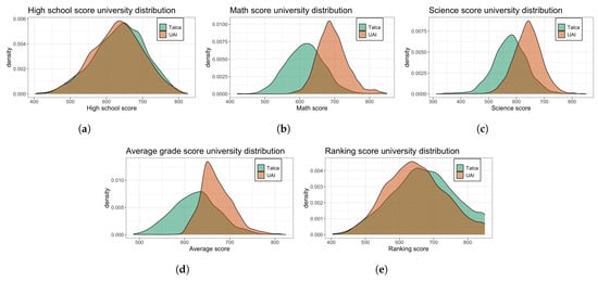 Figure 3 compares the score distributions of the student from both universities. Each plot shows an estimated distribution over the score used in this paper. As it can be observed, both students have very similar high school scores, see Figure 3e). This could be explained because there is no standardization among the grades from different schools. This means that two schools could have very similar grades for their students, but the level of each school could be drastically different. UAI students have better scores in all standardized tests (Figure 3a–d). In contrast, students from Universidad de Talca have better ranking scores, meaning that Universidad de Talca receives more top high school students than UAI.